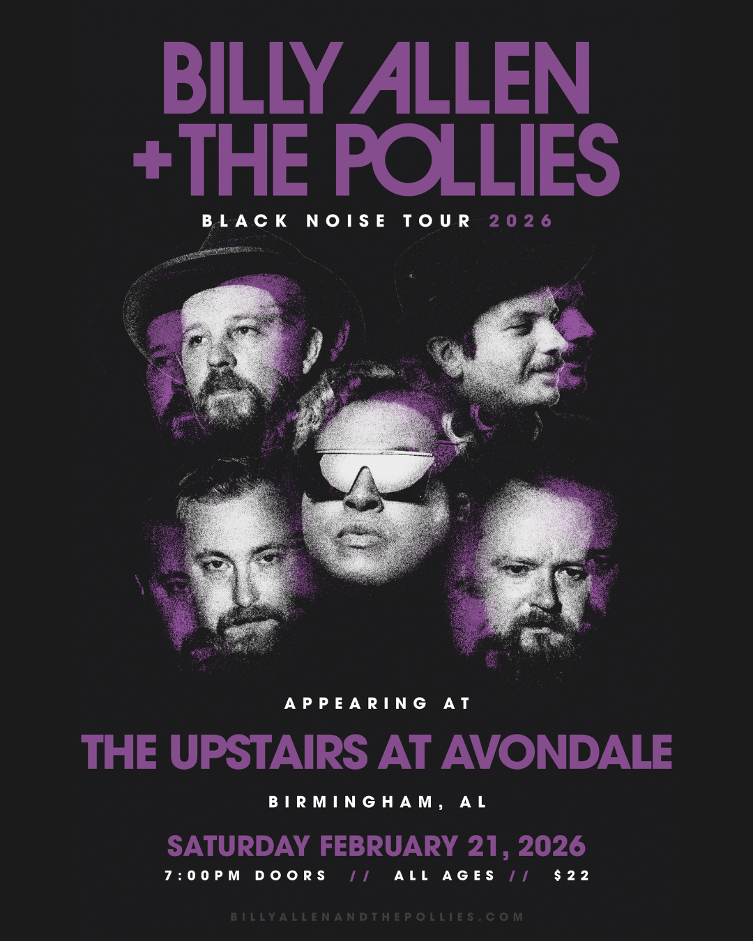 Back to All Events Billy Allen + The POLLIES - The Upstairs at Avondale Saturday, February 21, 2026 8:00 PM 10:00 PM The Upstairs at Avondale 201B 41st Street S Birmingham, AL 35222 (map) Google Calendar ICS GET TICKETS HERE Doors 7:00 PM | Show 8:00 PM CST. This event takes place at The Upstairs at Avondale. This venue is accessible by & elevator stairs and is indoors. Please visit our FAQ page for more details.