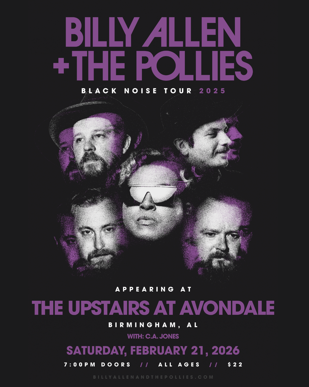 Billy Allen + The POLLIES w/ C.a. JONES - The Upstairs at Avondale Saturday, February 21, 2026 8:00 PM 10:00 PM The Upstairs at Avondale 201B 41st Street S Birmingham, AL 35222 (map) Google Calendar ICS GET TICKETS HERE Doors 7:00 PM | Show 8:00 PM CST. This event takes place at The Upstairs at Avondale. This venue is accessible by & elevator stairs and is indoors. Please visit our FAQ page for more details.