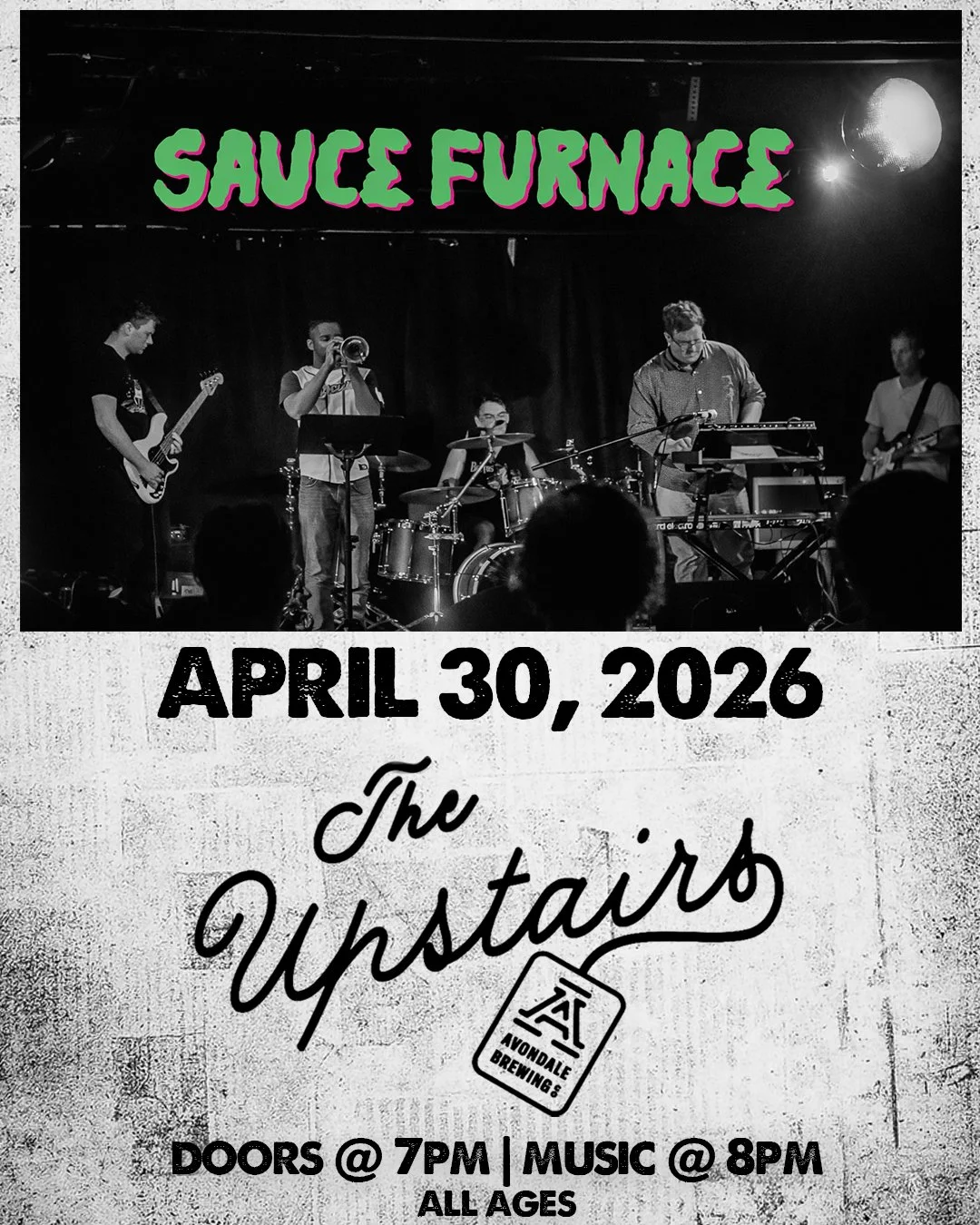 Back to All Events SAUCE FURNACE - THE UPSTAIRS @ AVONDALE BREWING Thursday, April 30, 2026 8:00 PM 10:00 PM The Upstairs at Avondale 201B 41st Street S Birmingham, AL 35222 (map) Google Calendar ICS GET TICKETS HERE Doors 7:00 PM | Show 8:00 PM CST. This event takes place at The Upstairs at Avondale. This venue is accessible by & elevator,stairs and is indoors. Please visit our FAQ page for more details.